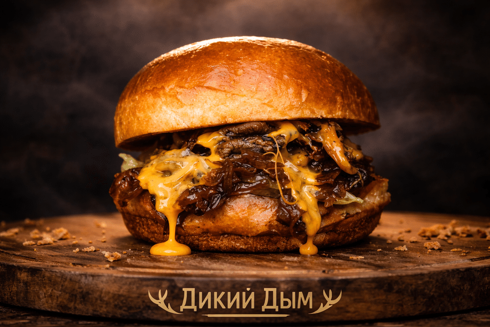 Нежная говядина в соусе кальби, сыр чеддер, карамелизированный лук и мягкая булочка бриошь. Яркий вкус корейского BBQ
