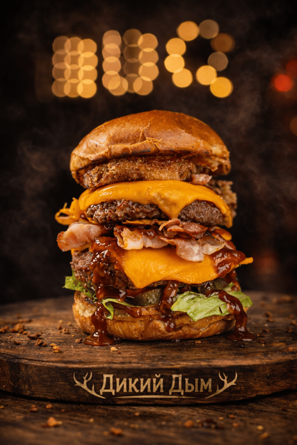 Двойная сочная говяжья котлета, расплавленный чеддер, хрустящий бекон, свежий салат, маринованные огурцы и фирменный BBQ-соус на мягкой поджаренной булочке