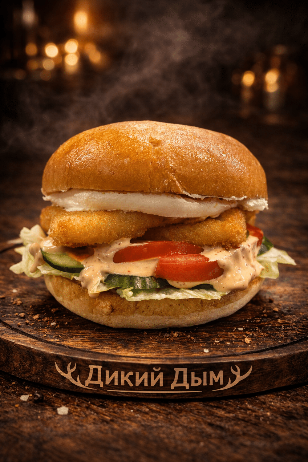 Булочка бриошь, сочное куриное филе в хрустящей панировке, салат айсберг, маринованные огурцы и фирменный соус