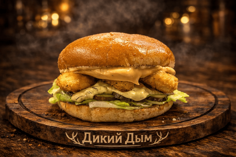 Булочка бриошь, растительная котлета, айсберг, томаты, свежий огурец, красный лук и фирменный соус