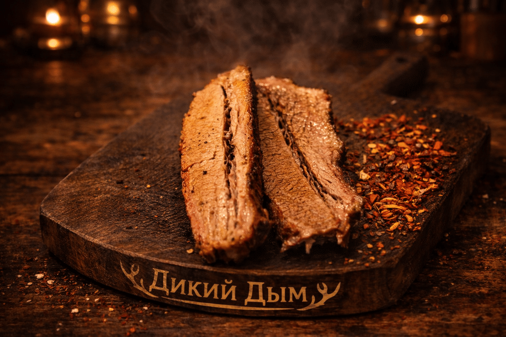 Медленно копчёная говяжья грудинка длительного приготовления. Сочное мясо с насыщенным ароматом натурального дыма и фирменной BBQ-корочкой