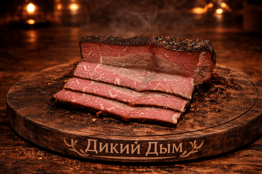 Говяжья лопатка, выдержанная в специях и медленно копчёная по технологии пастрами с глубоким мясным вкусом.