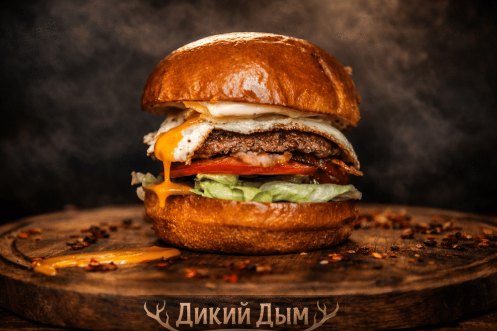 Сытный бургер с котлетой из мраморной говядины, беконом и яйцом. Айсберг, маринованный огурец, красный лук и соус BBQ создают насыщенный домашний вкус